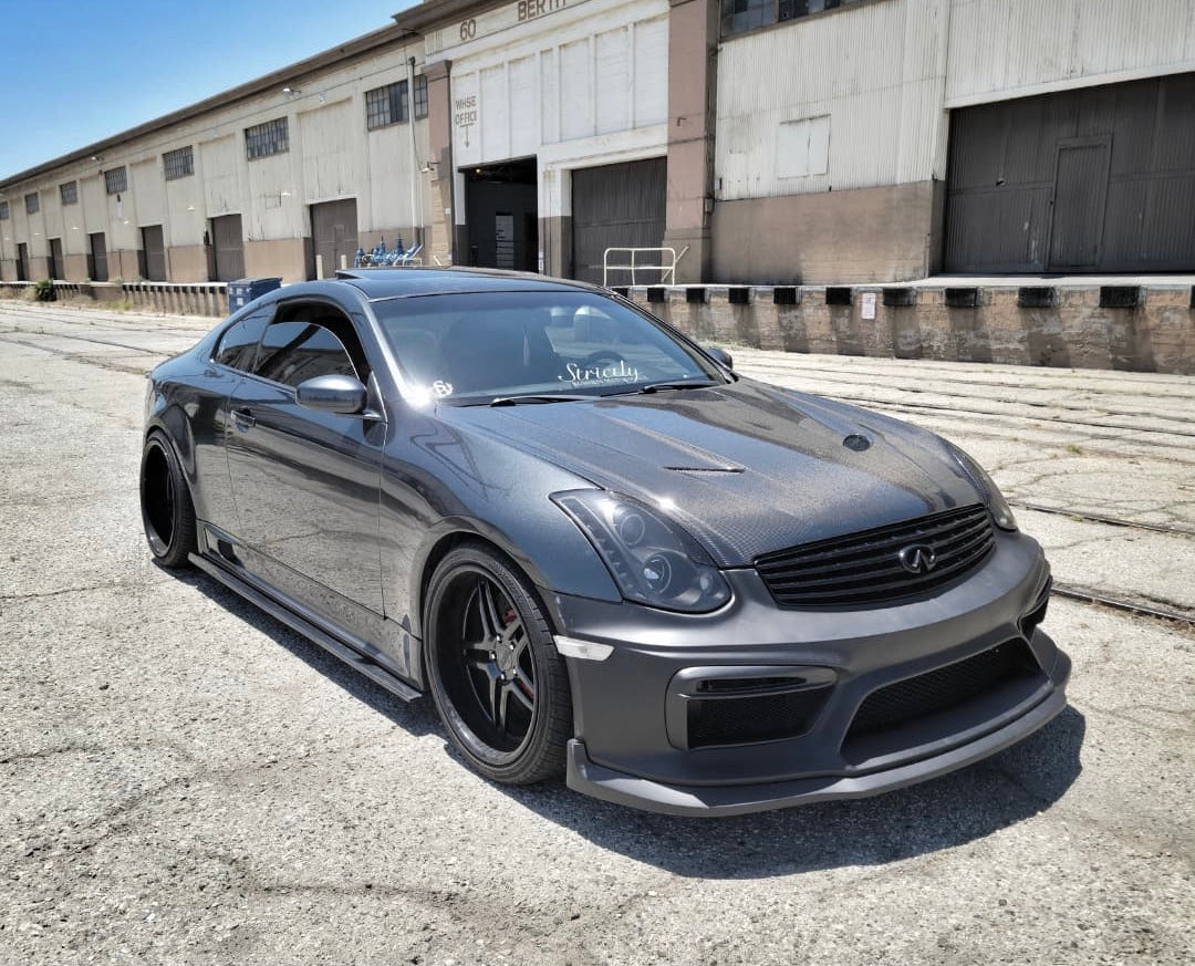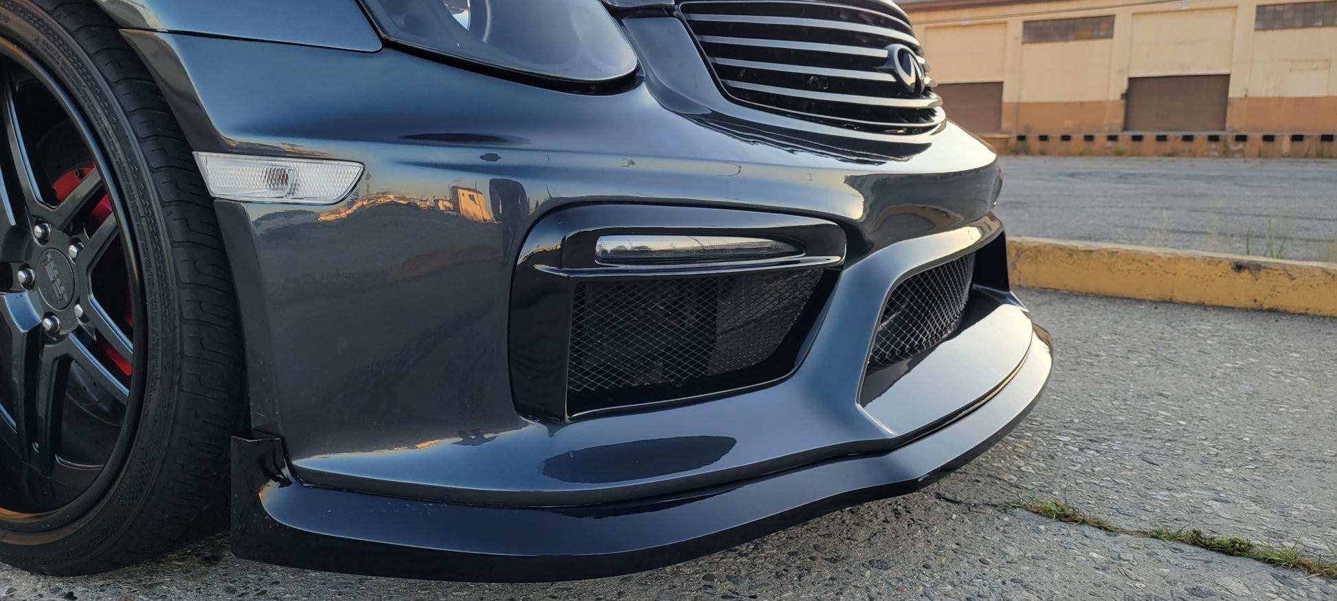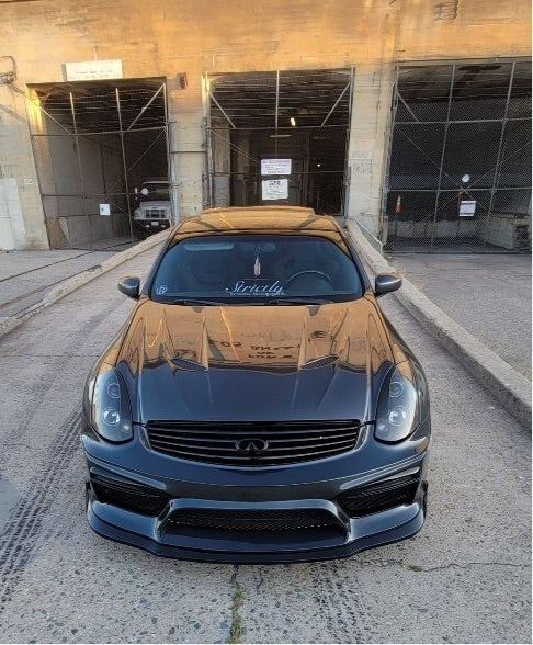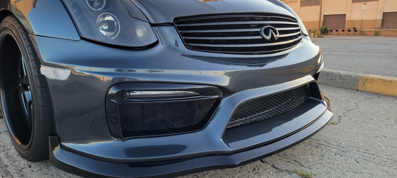 This item will fit 03-07 G35 coupes only. Available in Fiberglass only, with special order optional Carbon Fiber lip. 2” of the bash bar may need to be cut on each side for proper fitment. (2014-2016 Porsche Cayman DRL lights not included) trimming of the bash bar required to adapt DRL lights*. Professional installation is always advised.