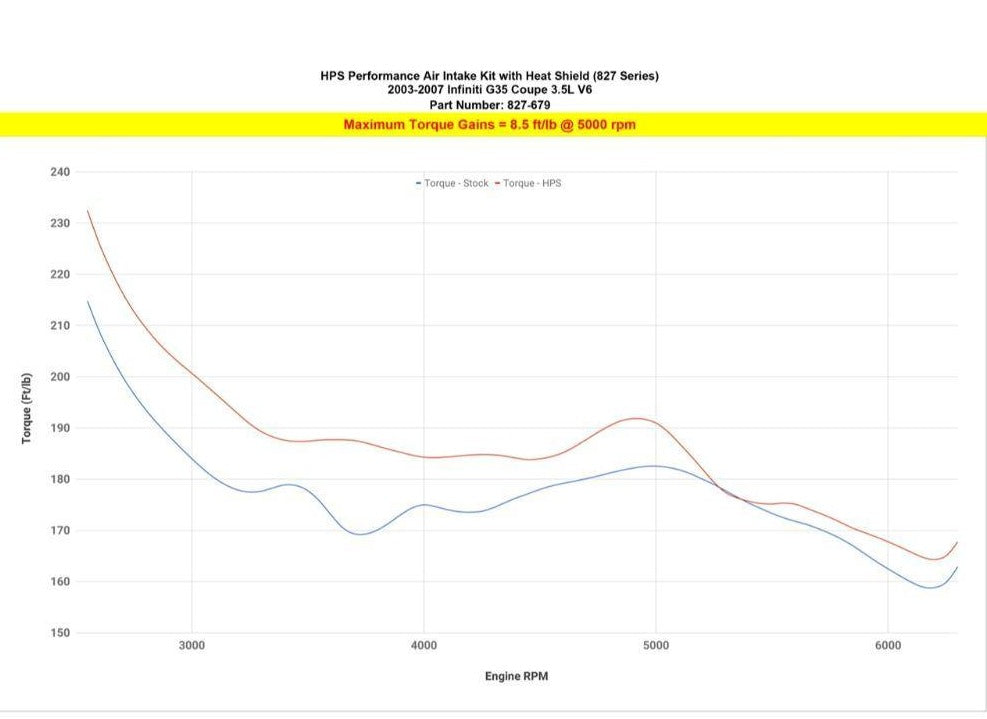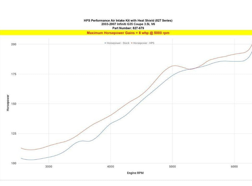 HPS Performance 827 Series air intake kit (Part # 827-679) for 2003-2007 Infiniti G35 Coupe 3.5L V6 offers a free-flowing 3-1/4 inch mandrel-bent aluminum tube induction system designed to produce dyno proven performance gains increase horsepower +8 whp , torque +8.5 ft/lbs and improve throttle response while maintaining safe air fuel ratio. The heavy duty powder coated steel heat shield blocks out hot air from the engine for the best cooling effect. The included installation manual has clear pictures and instructions to guide the installer throughout the whole process. The kit does NOT require tuning and does not trigger CEL light. No modification is required during the installation. HPS light weight mandrel-bent aluminum alloy tube replaces the stock restrictive air box and optimizes the airflow with excellent heat dissipation and long lasting durability. HPS Performance 827 Series shortram cold air intake kit features race proven reinforced silicone hoses and industrial grade 100% stainless steel t-bolt clamps which ensures reliability, even during the most extreme driving conditions. Proudly made in the United States, the All-New HPS Performance Air Filter is designed with performance in mind, delivering excellent filtration without sacrificing airflow.
