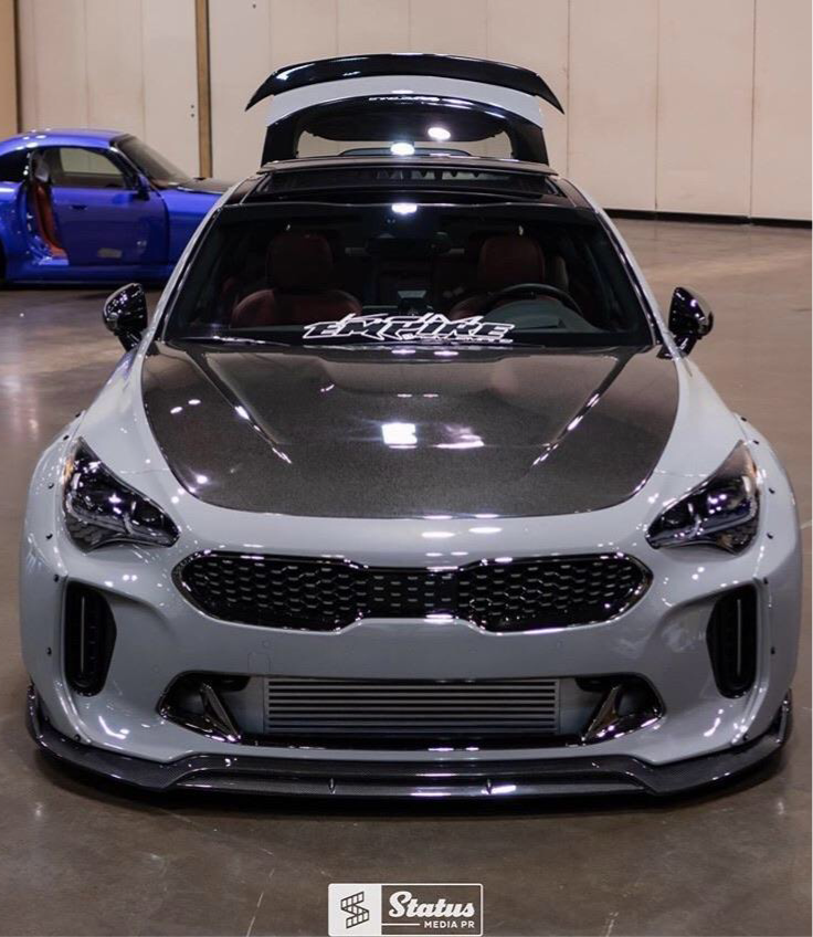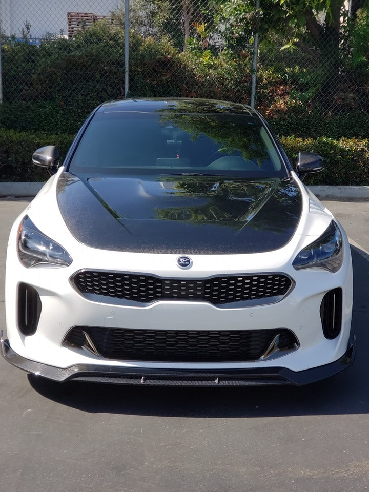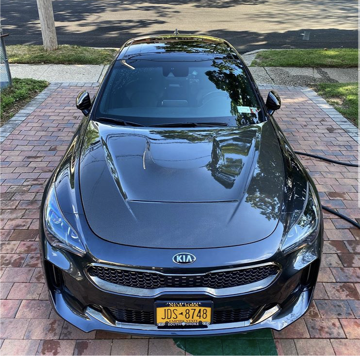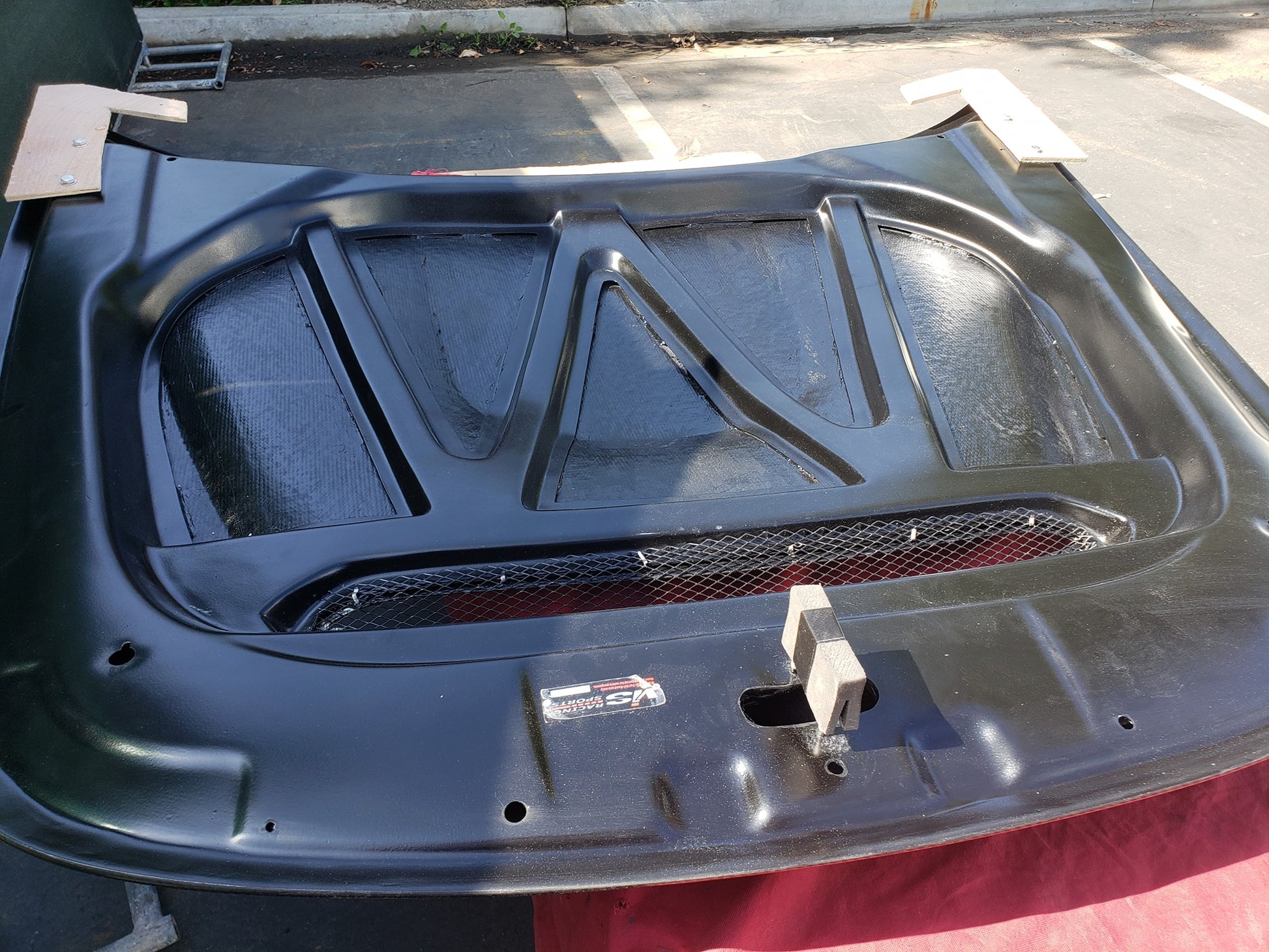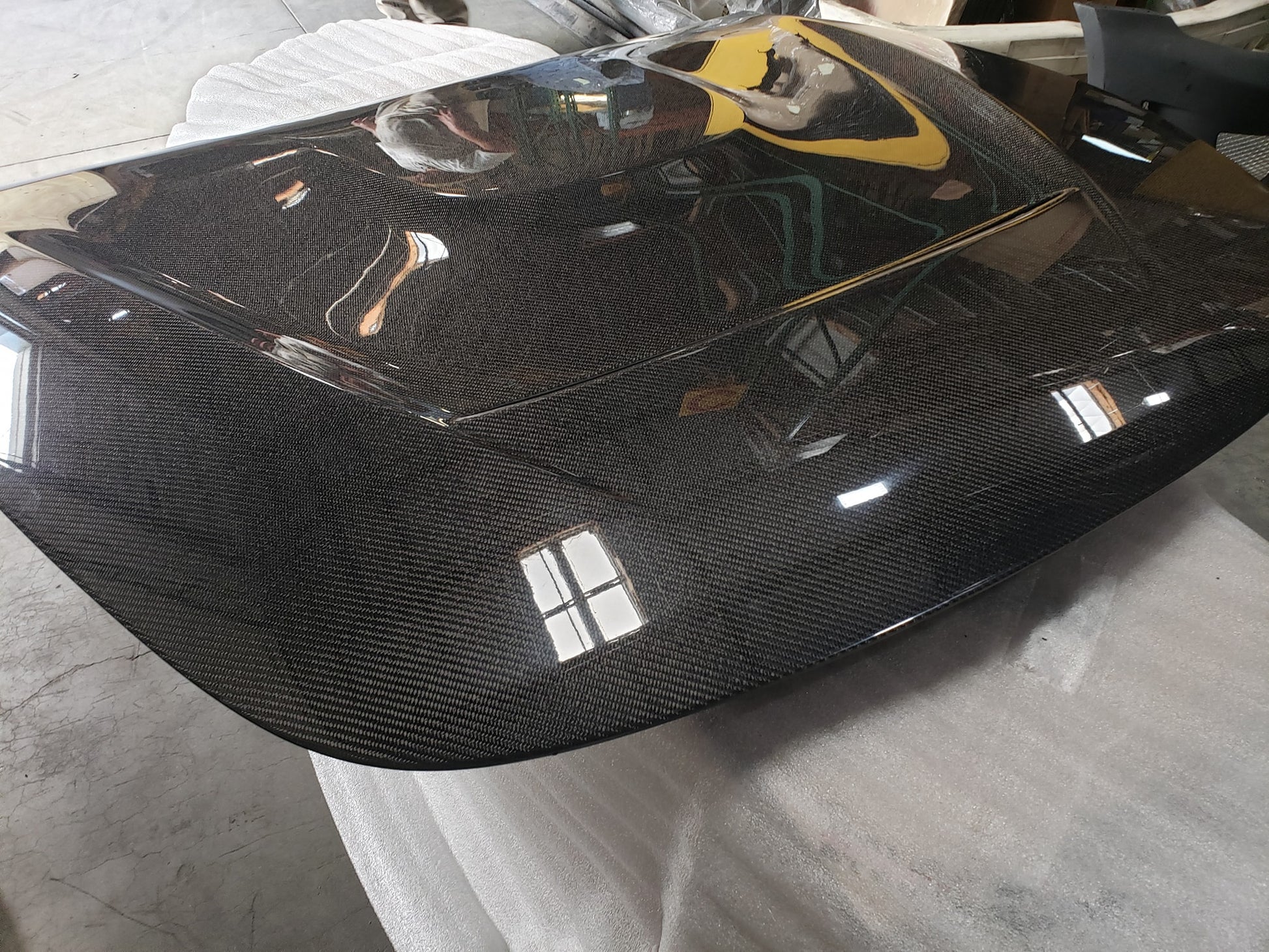 Our SBGT M CF hood. Don't use with OEM hood shocks. SBM doesn't recommend any hood shocks/struts. Our Carbon Products aren't clear coated we have UV protection in the resin and we polish the resin to shine looking like clear coat.