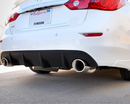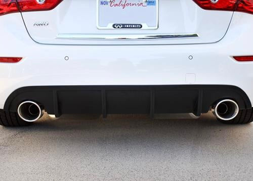Q50 owners looking to add some style to the rear bumper now have a choice with the STILLEN Rear Diffuser for the 2014 Infiniti Q50.This rear diffuser is made of durable polyurethane, and installs without cutting, trimming or altering the vehicle in any way. The part comes with proper 3M automotive trim foam tape pre-installed onto the diffuser, as well as adhesion promoter to make your installation quick and easy. Included are some screws to fully secure the diffuser. We are offering the diffuser either unpainted or painted matte black. The painted version arrives ready to install, or the unpainted version can be painted to the color of your choice just like the other STILLEN polyurethane body components. Customers have gone a variety of different routes, including gloss black, color matching the vehicle, dark gray on black vehicles, as well as making the diffuser carbon fiber looking with the help of hydrographics. The options are limitless!