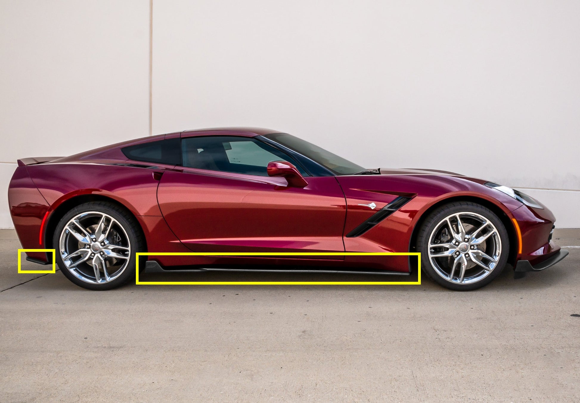2014-2019 Chevy Corvette C7 Side Skirts w/ Rear Corners. This Four Piece Kit includes Side Skirts (Side Splitters/Rockers) as well as the matching Rear Corner pieces. Designed to work with factory mounting locations for 2014-2019 Corvette C7 Stingray and Grand Sport. Combine with Street Scene Corvette C7 Front Splitter for a complete ground effects kit for your C7 Corvette.